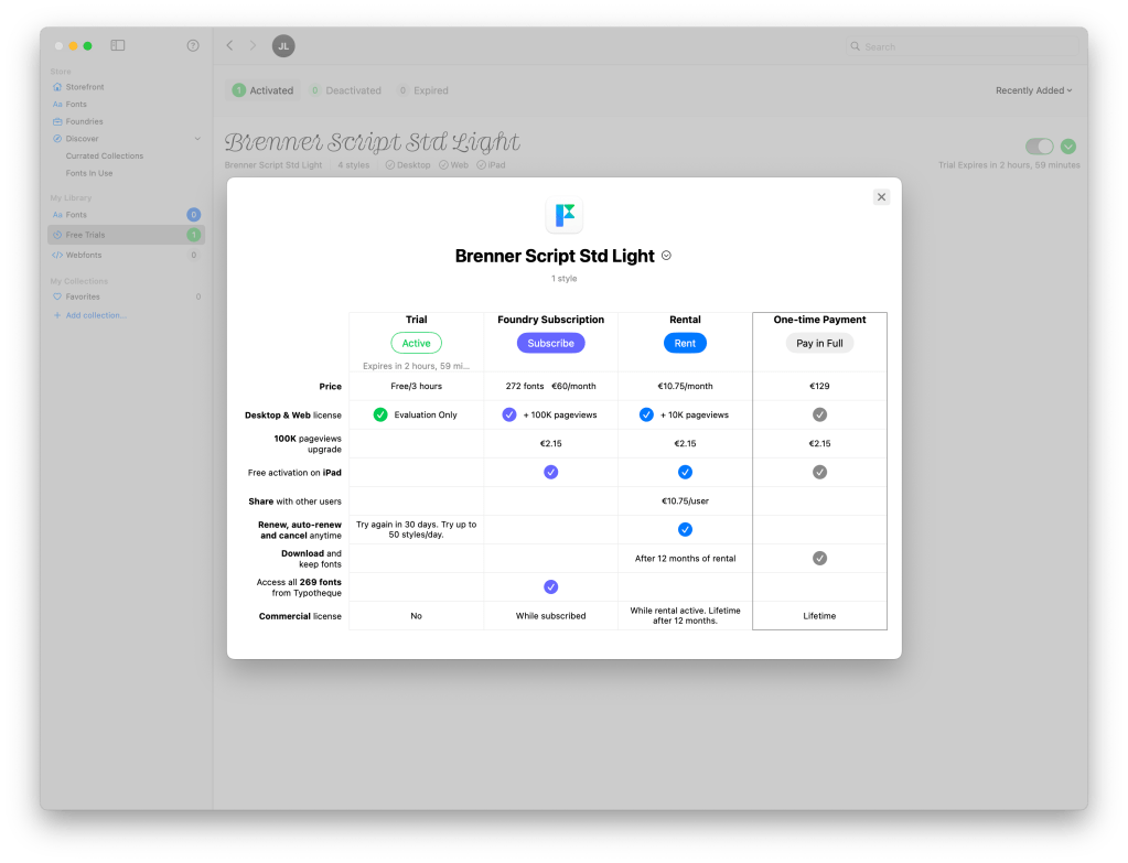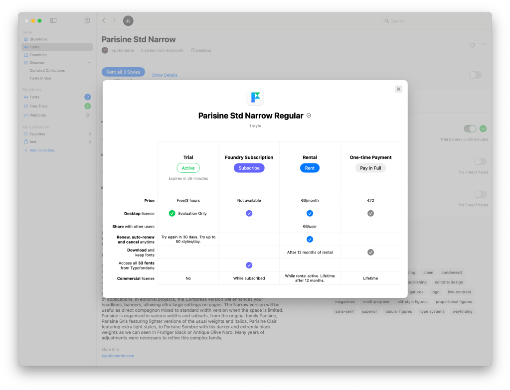 Enfin, un logiciel qui regroupe, comme iTunes le fait avec la musique, une multitude de fonderies et leurs fontes à tester, louer ou acheter. Il existe même un système d’abonnement à certaines fonderies.