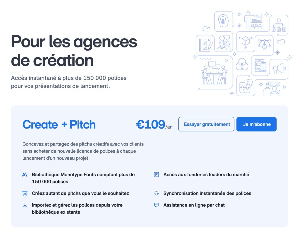 La première formule pour les agences de création : Create + Pitch (allez comprendre) coute 109€ mais là vous ne pourrez utiliser aucune police à des fins commerciales. Il ne s’agit juste que de projets (Pitch).
