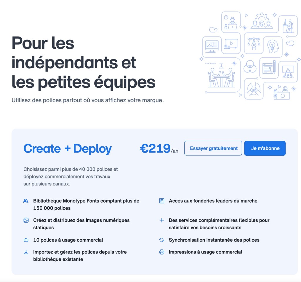 La deuxième formule pour les indépendants et les petites équipes : Create + Deploy, là seules 10 polices peuvent être utilisées à des fins commerciales et distribuées jusqu’à ‘à 5000 unités pour 219 euros par an et par utilisateur. Je peux rajouter des sièges supplémentaires (1 siège à 100$, 2 sièges à 180$, 5 sièges à 400$, 10 sièges à 800$, 20 sièges à 1500$)