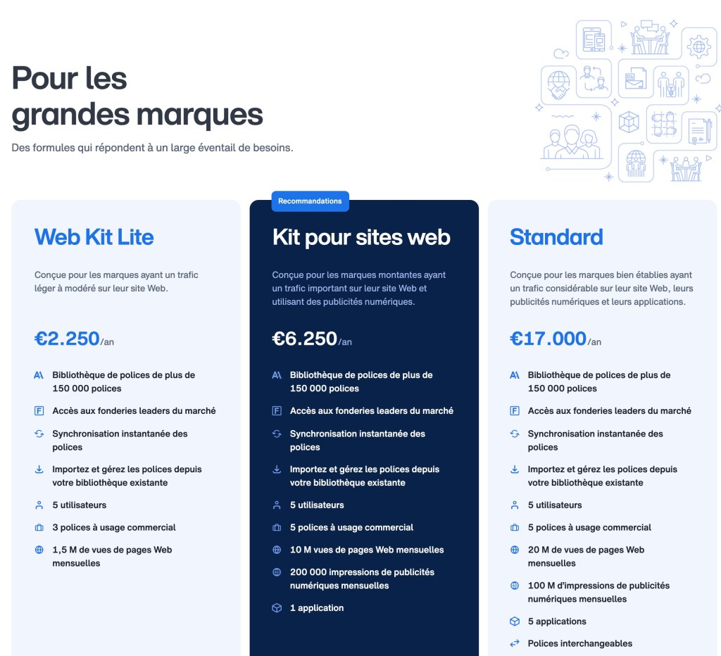 Impossible de comprendre quelle est la formule adaptée à mon usage. Ils emploient des termes que seuls eux sont capables de comprendre. J’ai donc fait appel à quelqu’un de chez Monotype qui m’a donc expliqué les formules, les prix et les options…